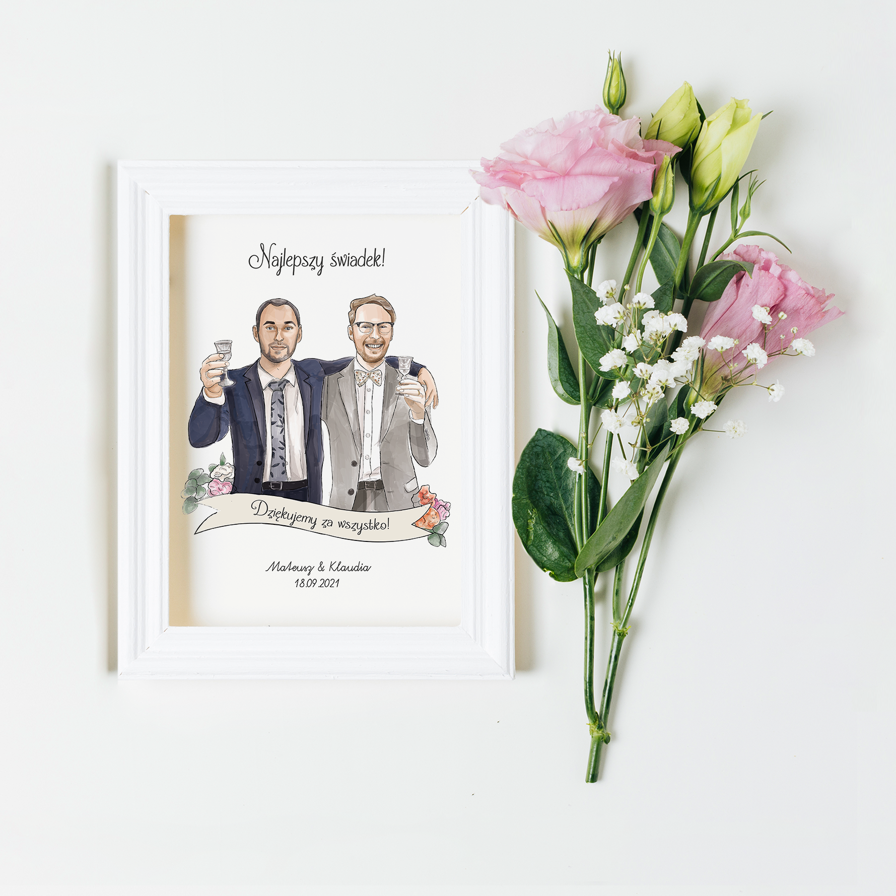 Cyfrowy portret dla świadka to prezent idealny, który z pewnością wywoła mnóstwo emocji i wzruszy niezwykle ważną i niezastąpioną osobę jaką jest świadkowa, wspierającą nie tylko w dniu ślubu, ale także podczas wszystkich przygotowań. W ilustracje, które wykonuję wkładam całe serce z dbałością o każdy najmniejszy szczegół, a gotowe portrety drukuję na wysokiej jakości płótnie lub papierze, dzięki czemu stanowią elegancką pamiątkę na długie lata.